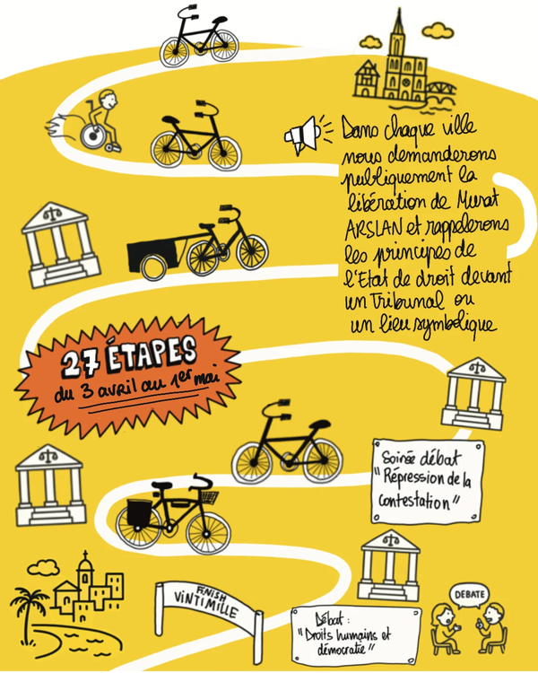 Tout au long du mois d'avril, le Syndicat de la magistrature sera sur les routes pour réaffirmer son soutien à Murat Arlsan, magistrat incarcéré en Turquie pour avoir défendu l'idée d'une justice indépendante. 30 étapes pour alerter, échanger et rouler ensemble jusqu'à nos ami·es italien·nes pour leur passer le relai.